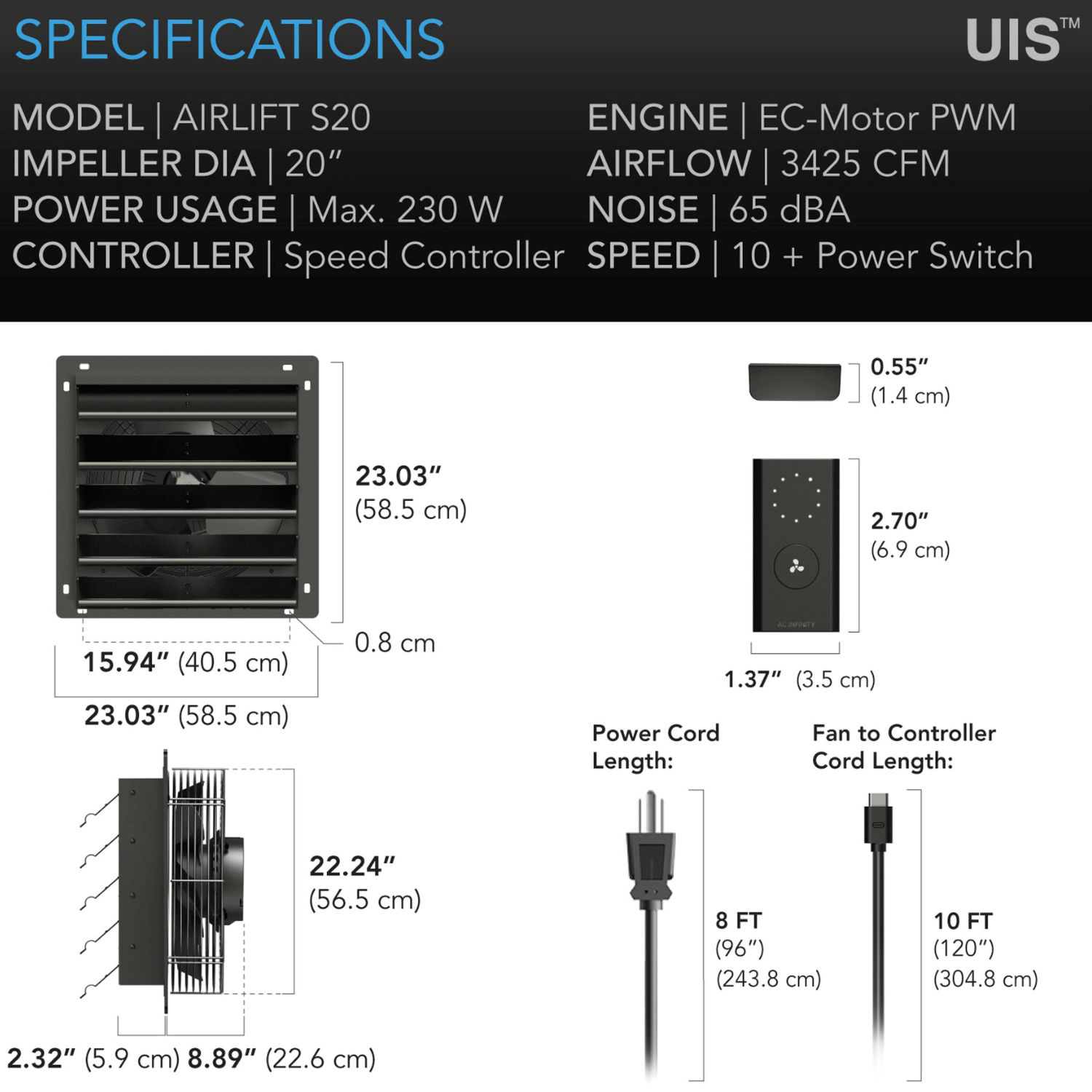 AC Infinity AIRLIFT S20, Shutter Exhaust Ventilation Fan 20", Speed Controller