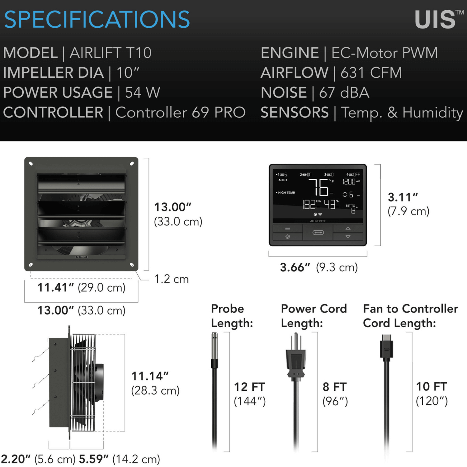 AC Infinity AIRLIFT T10, Shutter Exhaust Ventilation Fan 10", Temperature Humidity Controller