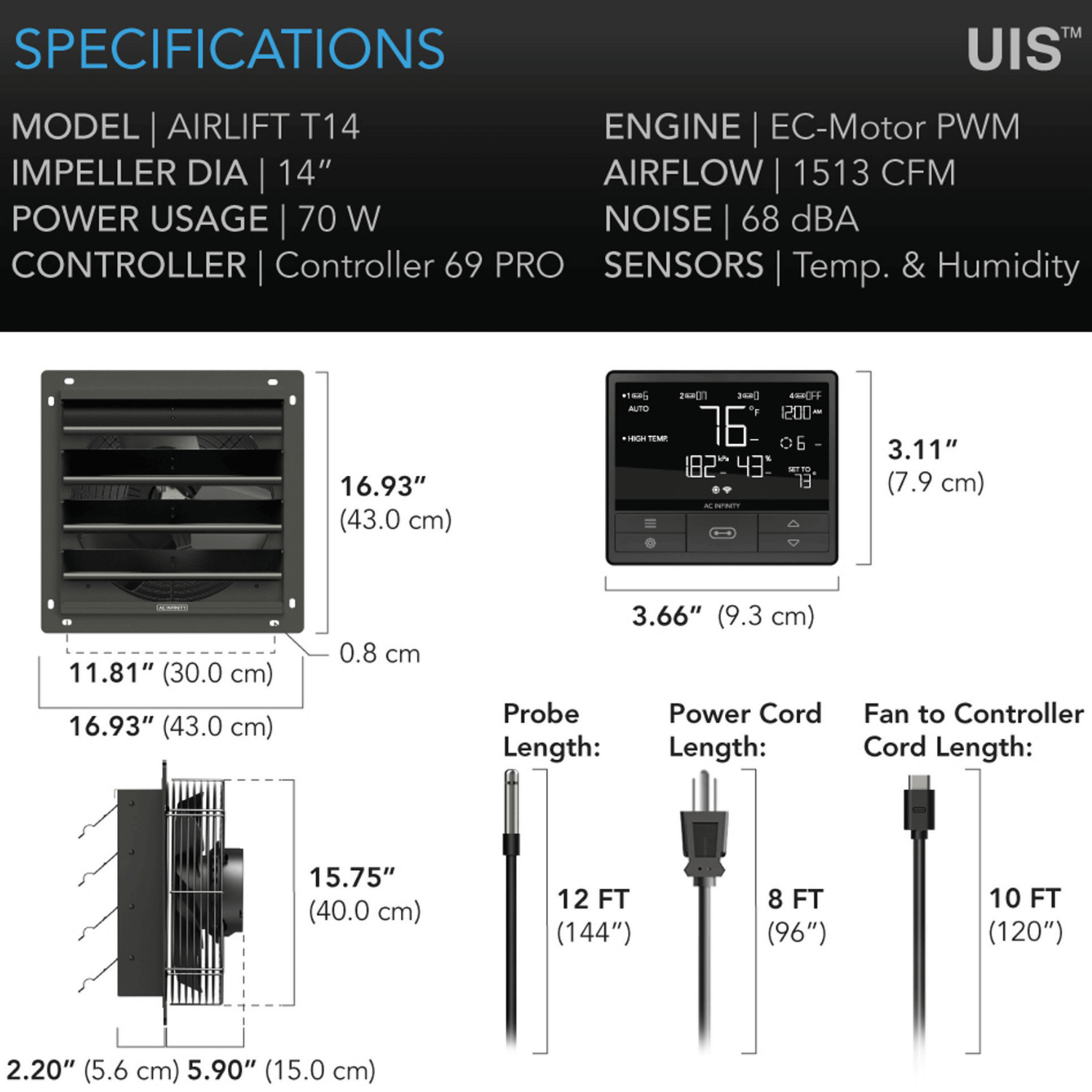 AC Infinity AIRLIFT T14, Shutter Exhaust Ventilation Fan 14", Temperature Humidity Controller