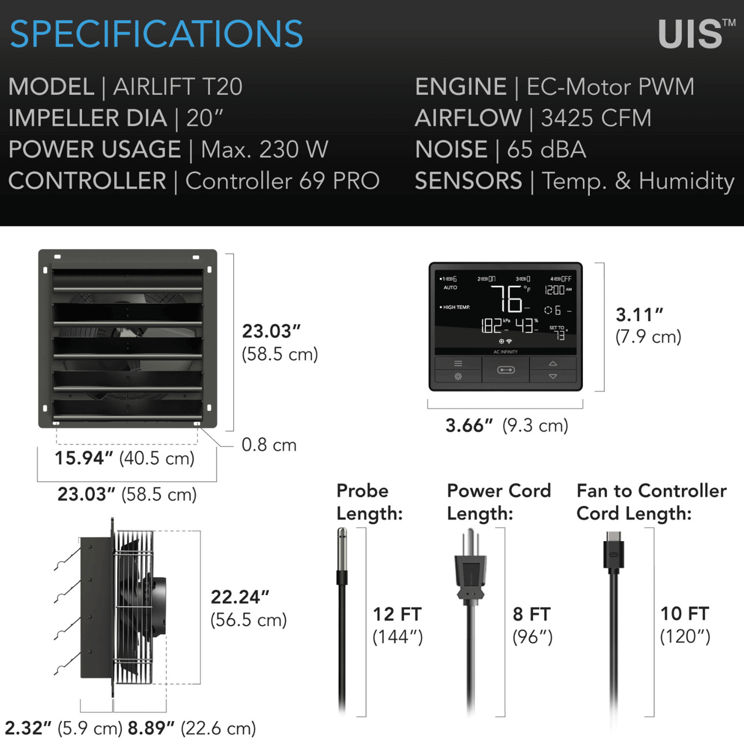AC Infinity AIRLIFT T20, Shutter Exhaust Ventilation Fan 20", Temperature Humidity Controller