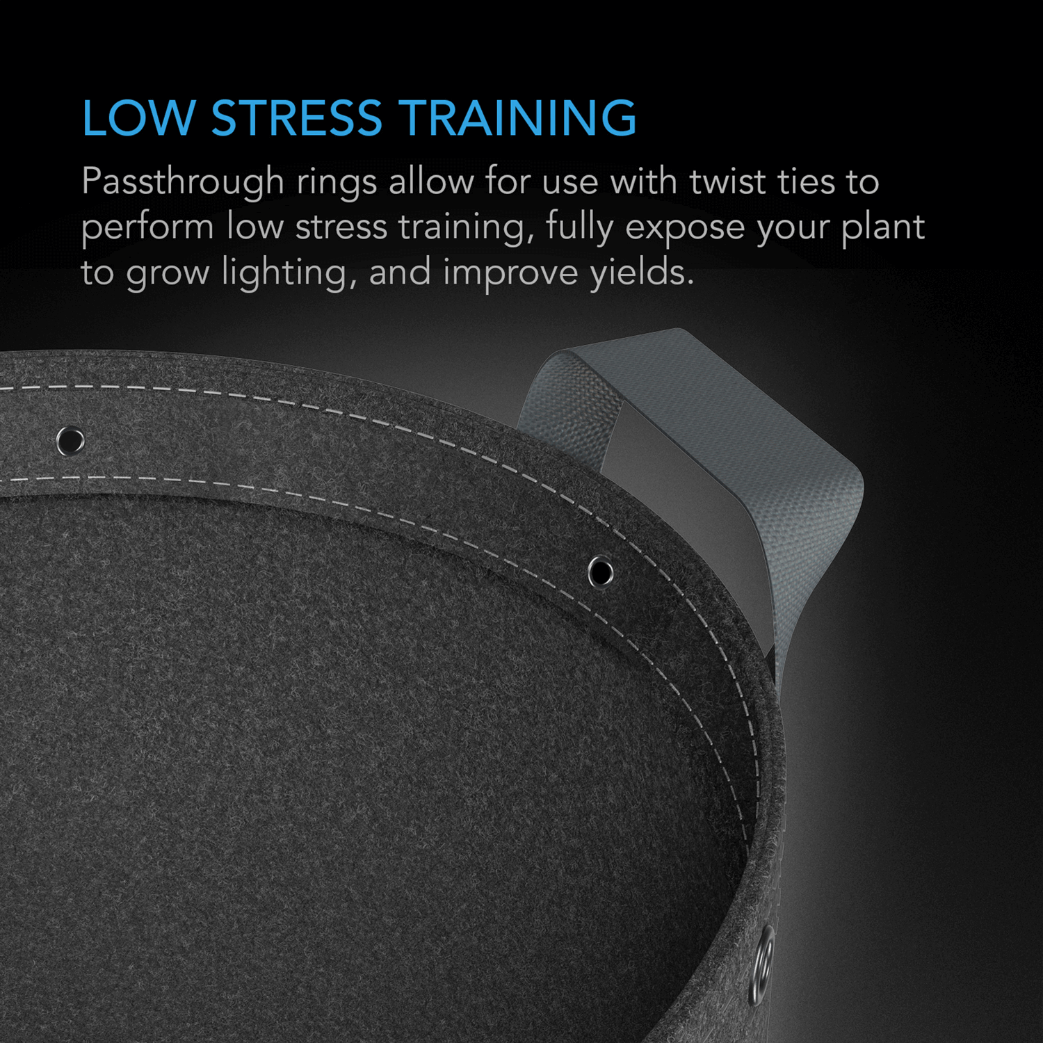 Along with durable handles for easy transportation, these fabric pots offer metal rings that allow twist ties to pass through for low-stress training and occasional plant hanging. The heavy-duty, rugged build endures wear and tear and can be machine-washed for reuse. Each planter accommodates a greater volume of soil when filled up to the dual stitch line, providing more root space for plants to flourish.