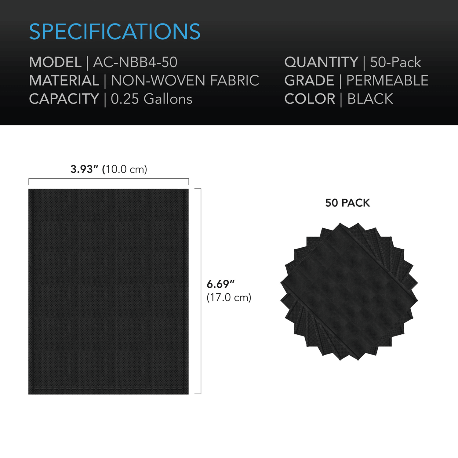 Each sleeve has a capacity of 0.25 Gallons and dimensions of 6.67 x 3.92 in. They are made of non-woven fabric and come in a pack of 50.