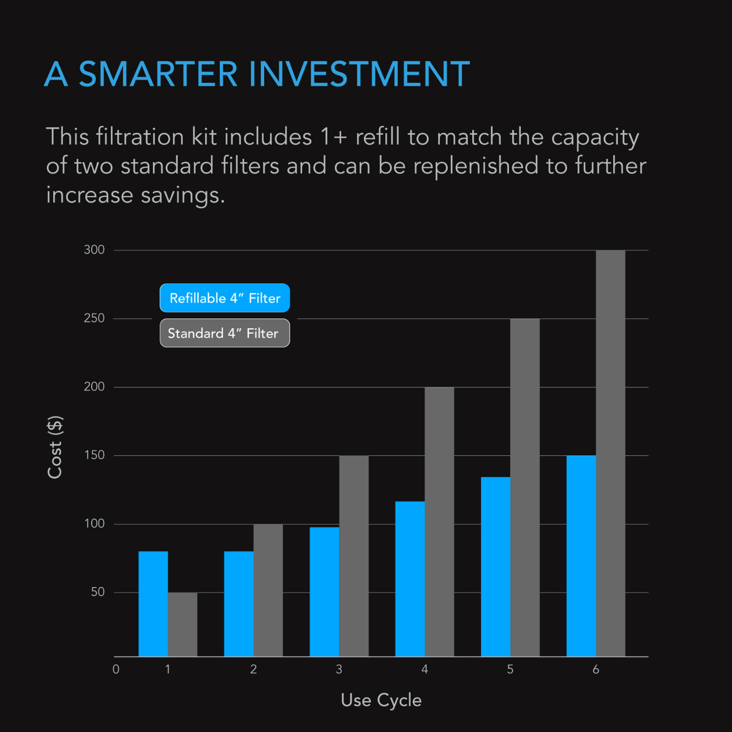 This patented design eliminates the need for replacing entire filters. The package includes over one refill, matching the filtration capacity of two standard 4" carbon filters, thereby offering a cost-effective solution. The removable twist-off flanges allow for easy, tool-free refilling using the included funnel and scoop.