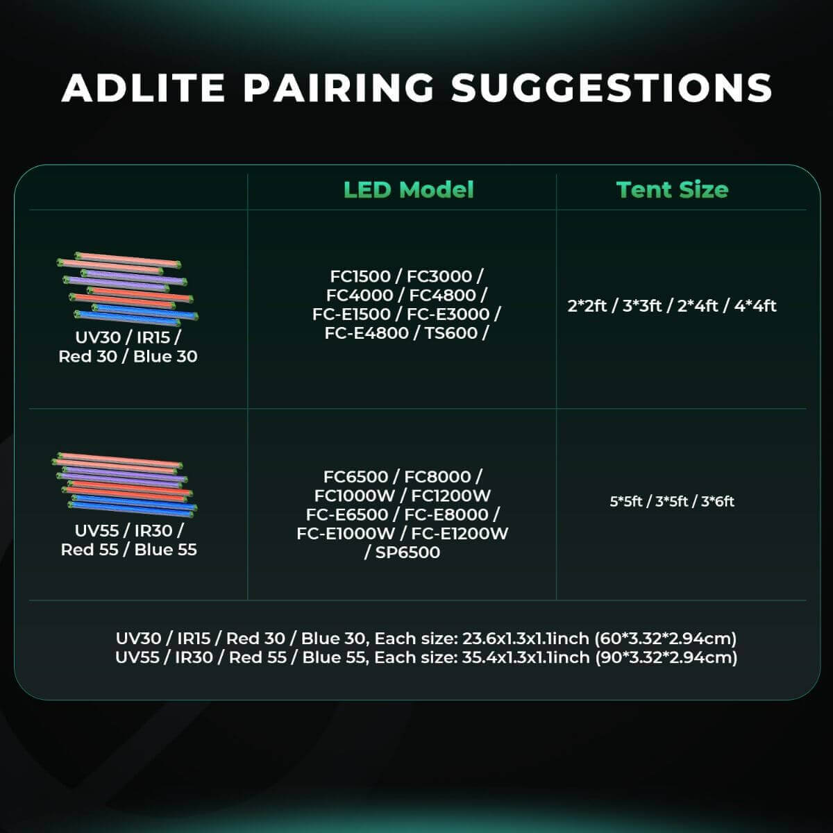 This product includes ADlite UV 55 and ADlite IR 30. With ADlite UV 55 providing a wavelength of 365-370 nm and having two light bars (27W each), and ADlite IR 30 offering a wavelength of 730-745 nm also with two light bars (15W each). It is suitable for pairing with main grow lights over 500W.
