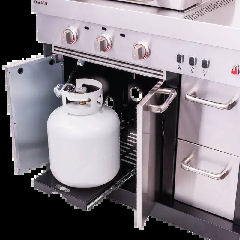 Enjoy outdoor cooking and entertaining with the Charbroil Medallion Series Modular Outdoor Kitchen Set! This essential modular outdoor kitchen configuration includes a 3-burner infrared gas grill, the corner component, and the entertainment sink component. The three components of this kitchen interlock together, making for a complete system. The 3-burner gas grill offers 565 square inches of cooking area and the infrared technology yields even heat, no flare-ups, and up to 50% juicer food. The porcelain-coated grates are rust-resistant and easy to clean, making this grill versatile, low maintenance, and large enough to cook all of your favorite dishes. The entertainment module boasts a fully functioning faucet and sink, removable insulated cooler, and cutting board inserts, in addition to a removable trash can and an electrical outlet. The corner module seamlessly connects the grill to the sink and other necessities, making this set the ultimate entertainment space. The stainless-steel finishes and granite countertops make this an attractive and durable addition to any outdoor space. Say hello to the outdoor kitchen of your dreams.