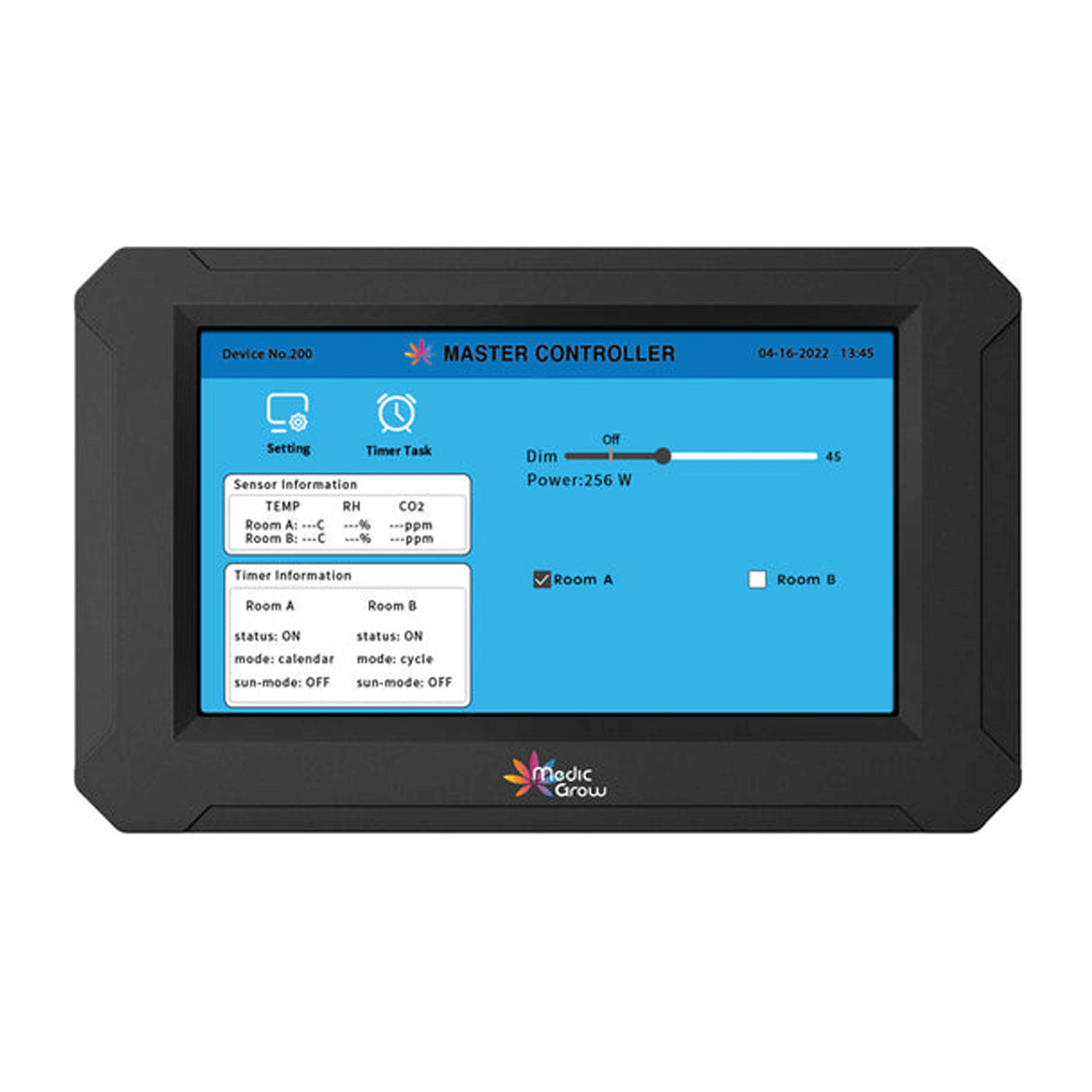 The TSC-2 controller supports control of up to 200pcs Spectrum Y Wireless or 70pcs Medic Grow LED Grow Lights. It is suitable for 1-2 grow rooms and provides both wireless and 0-10V dimming controlment. The controller offers centralized unit for switching, dimming, and spectrum adjustment. It also supports monitoring CO2, temperature, and humidity with a 3-in-1 sensor. It is characterized by practical functions such as GLT timer for optimal growing and power saving, besides calendar and cycle timer. It simulates sunrise and sunset settings, which can range from 5-30 minutes, leading to an improve users' experience due to its LCD touch screen. It also includes a safety feature which dims to 70% for preset temperature and auto shutdown for preset over-temperature protection. The controller also offers 12V Output for other external devices and is capable of system updating by Wi-Fi. The system is also protected against short circuits.