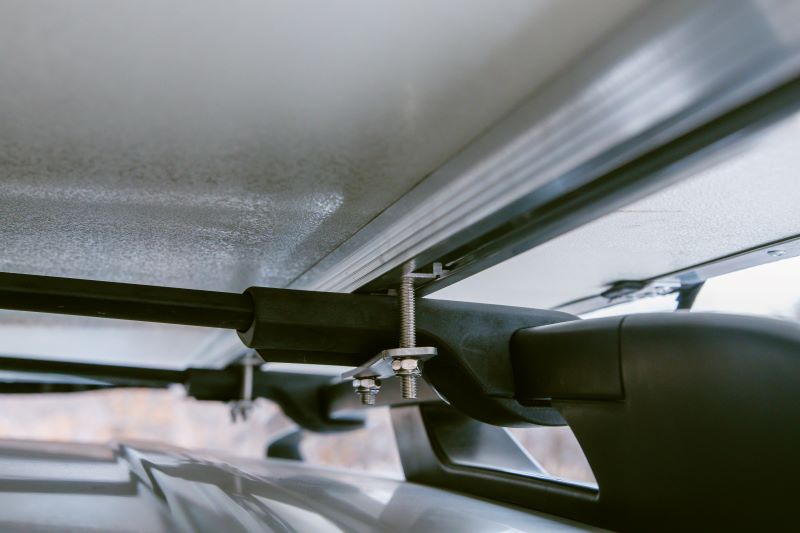 To mount the Overland Junction Labrador on your vehicle, you'll need crossbars or a roof rack or bed rack that has crossbars. Crossbars are the ones that run from one side of the car to the other.