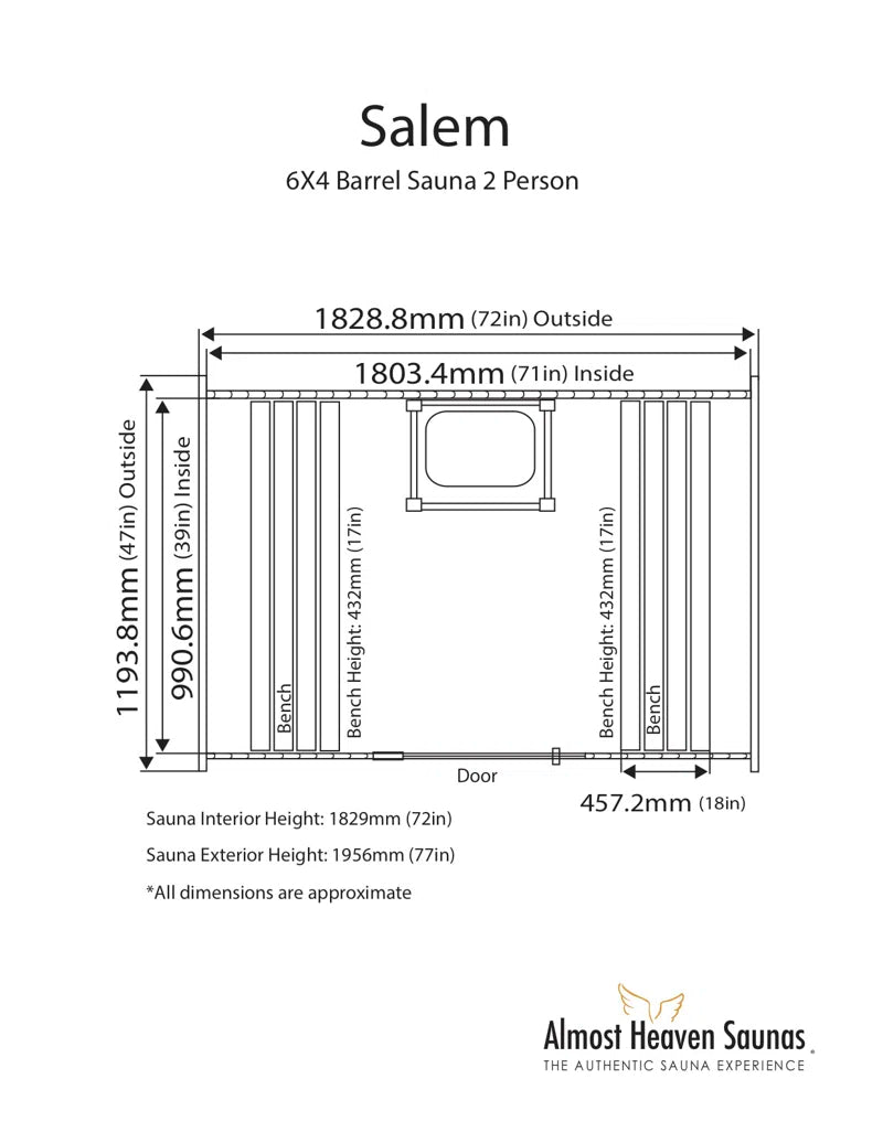 The Salem sauna is designed for those with a long to-do list and an eye for efficiency. Built to accommodate two people, this 6’x4’ traditional sauna will be at home in any backyard or home gym. Its compact design brings the sauna experience to your door without compromising space. Paired with a Harvia 4.5kW electric heater properly installed, the heater included in your sauna kit should consistently achieve temperatures of 175-185F in 45-60 minutes, turn the dial to delay the start time up to eight hours, knock off your to-do list, and relax in the rewarding heat: the choice is yours! Accessories can be purchased separately.