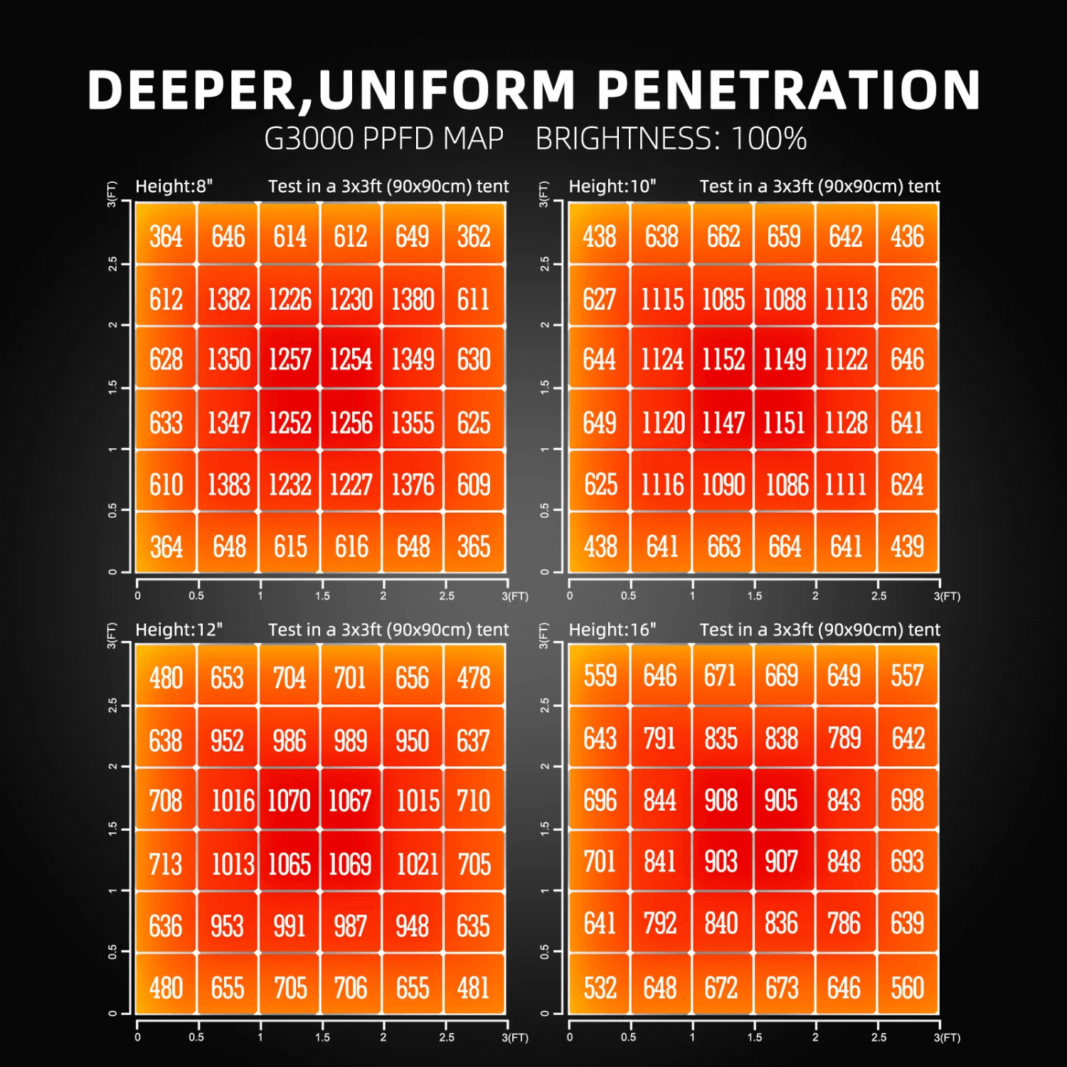 The G3000 LED grow light features a full spectrum (3200-4200K, 4800-5000K, 650-665nm) with varying wavelengths of light, making it suitable for every stage of plant growth, from seed to harvest.