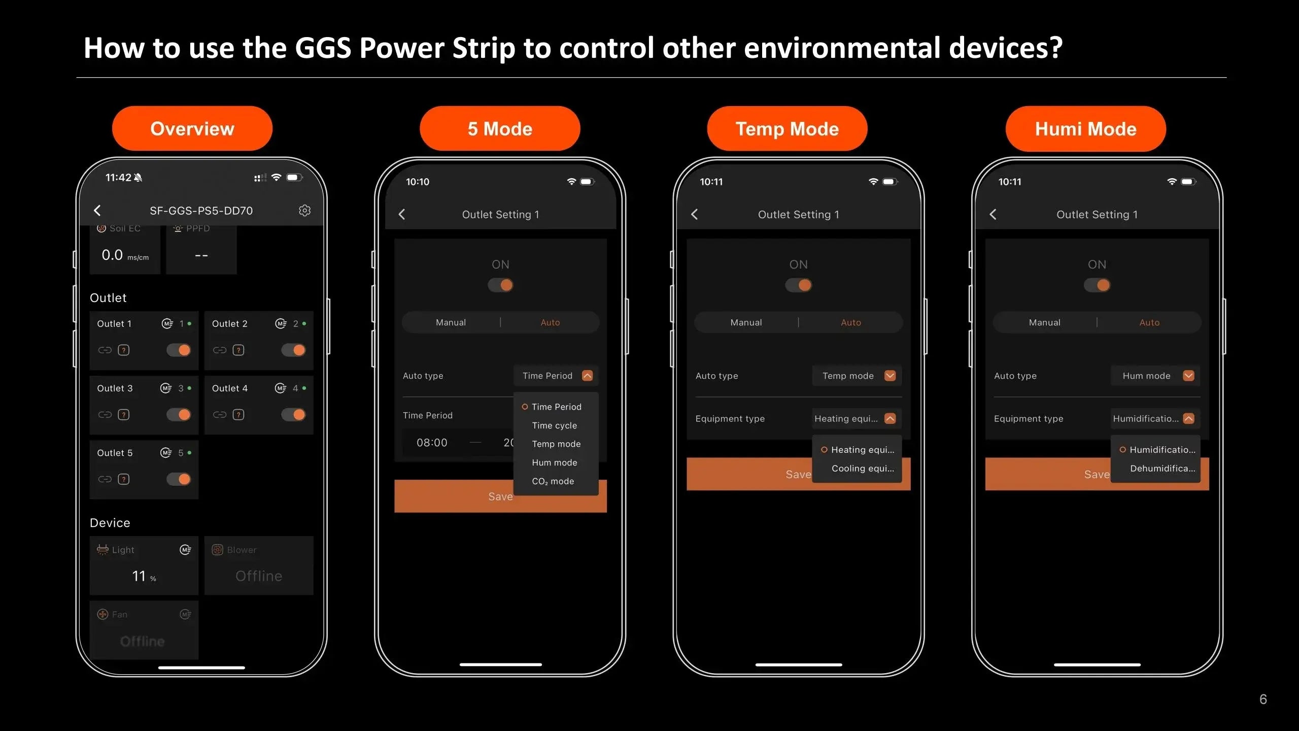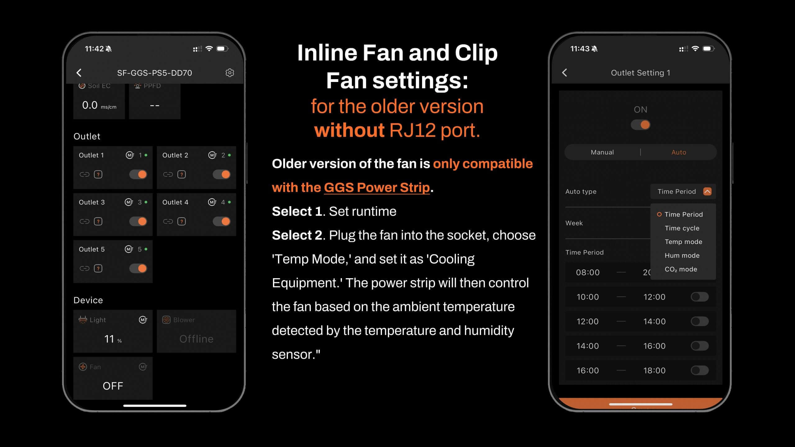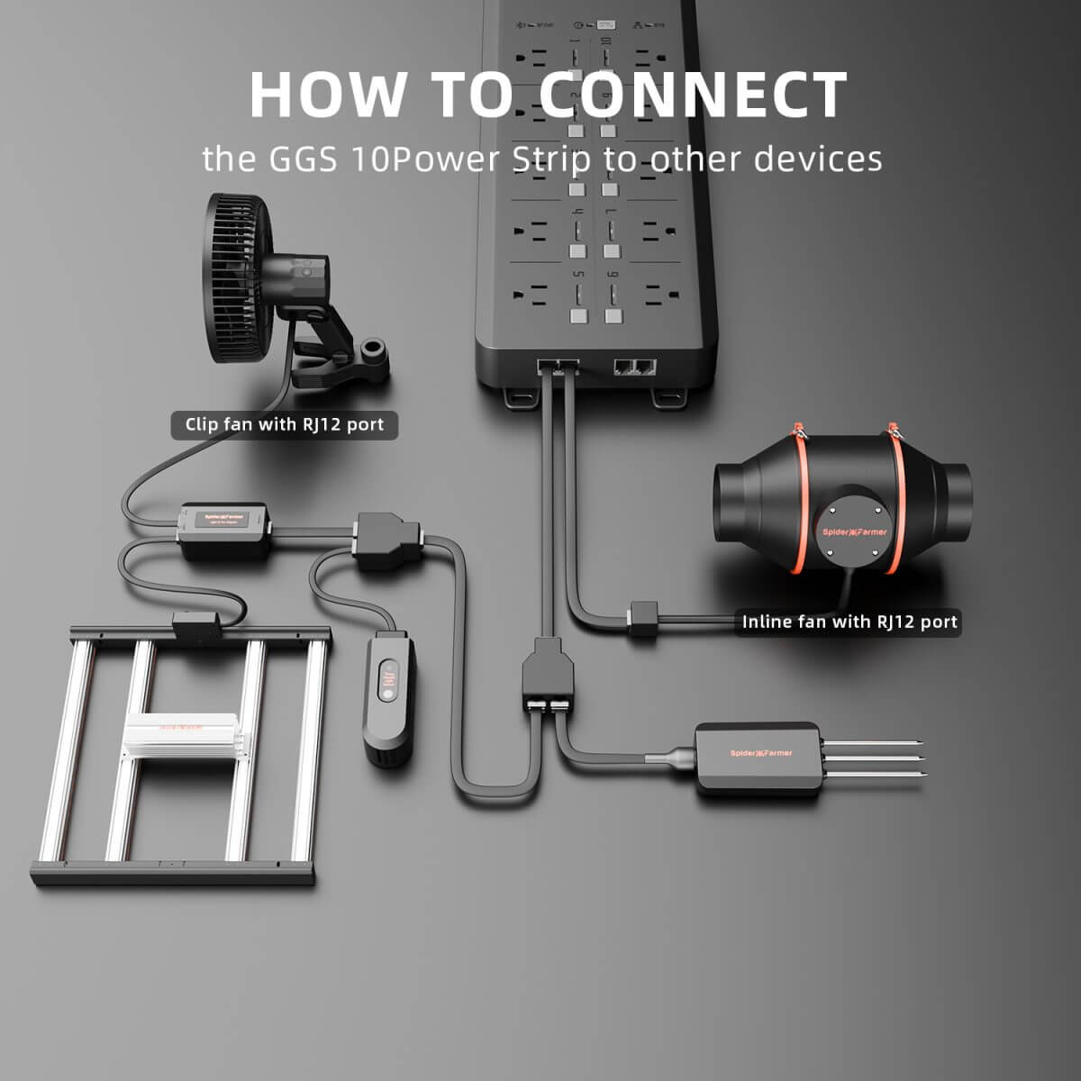 The GGS AC10 power strip showcases 10 individual outlets, enabling control and power for up to 5 devices. Utilizing the Spider Farmer app, it's possible to manage SF Series (excluding SF1000D, SF300, SF600), G Series and SE Series LED grow lights remotely. RJ12 clip/inline fans enable precise scheduling, standby speed, and oscillation settings. Fans without RJ12 ports can still be managed using on/off timers.