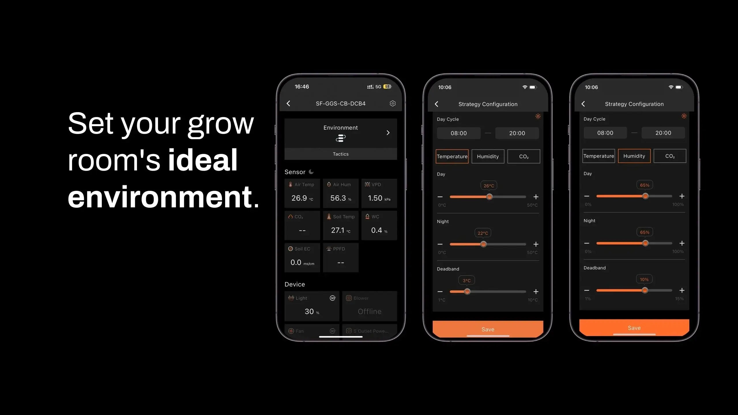The controller provides a quick view of the current date and time in your room. It has icons displaying the light or dark cycle of your room along with temperature, humidity, and Vapor Pressure Deficit (VPD) readings. While special sensors, not included in the kit, are required for CO2 and PPFD data.