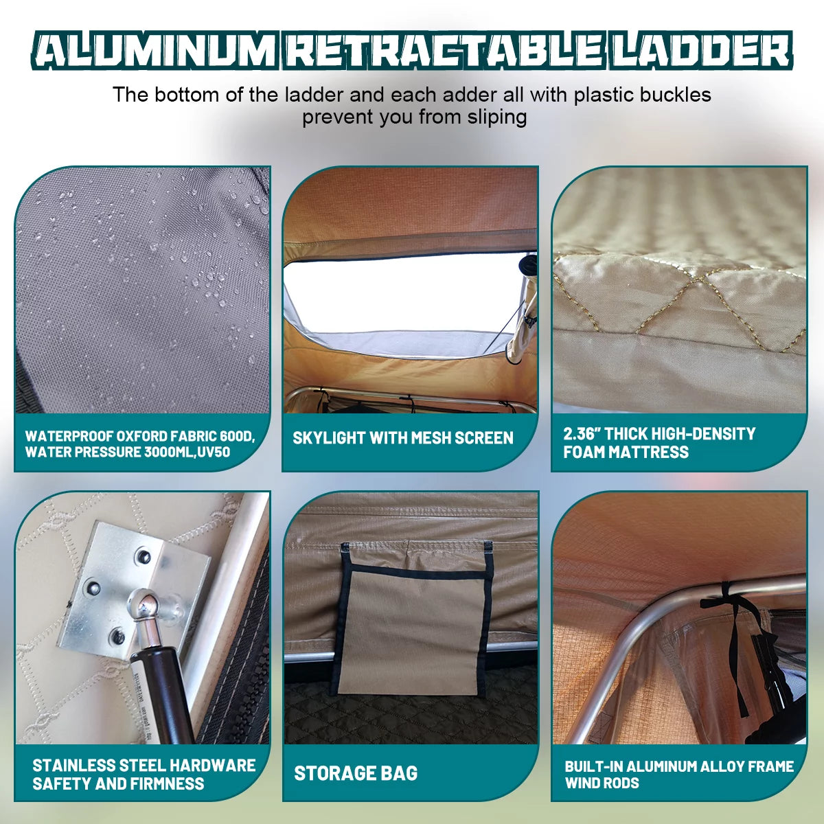 Rooftop Tent Unique Design ï¼ uD83DuDC99The tent is designed with doors, sun-shading and ventilative. The sunroof rooftop tent features extended pull rods, which creat a small balcony for you to view more scenery. It can store personal items, practical and convenient. The side windows of rooftop tent is designed with mosquito netting, providing you a good sleeping environment.