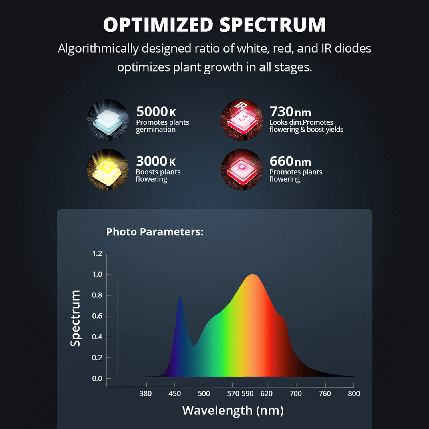The system encompasses a 660nm red light, 3000K to 5000K white light, and a 730nm far red IR spectrum. This provides plants in all stages from veg to flower with everything they need, just like natural sunlight.