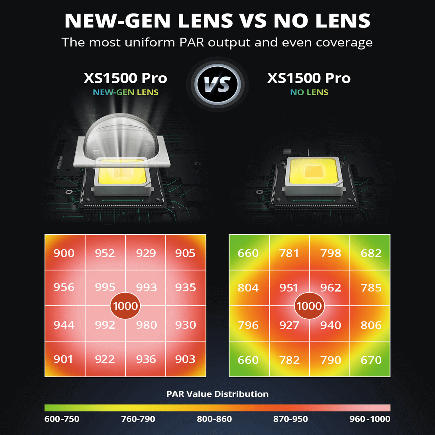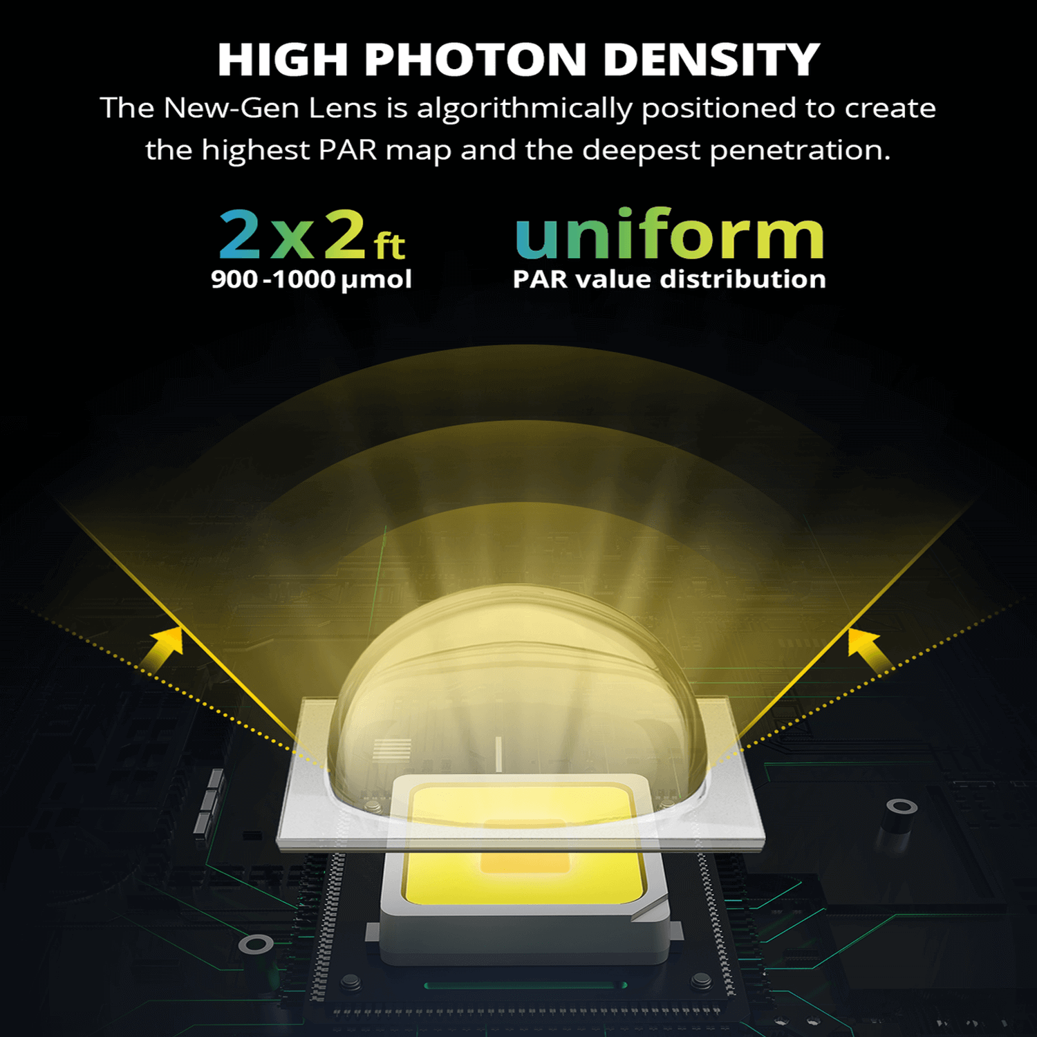 This design ensures concentrated light and minimal light loss, achieving uniform PPFD for optimal photosynthesis and growth. It ensures that plants absorb balanced PPFD in each corner, leading to balanced growth for healthier plants and higher yields.
